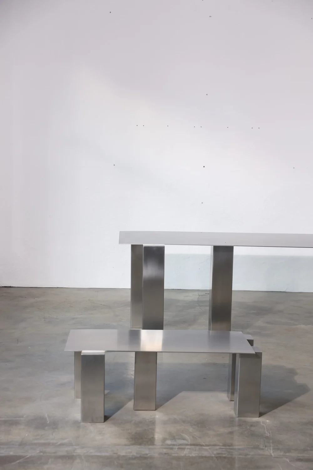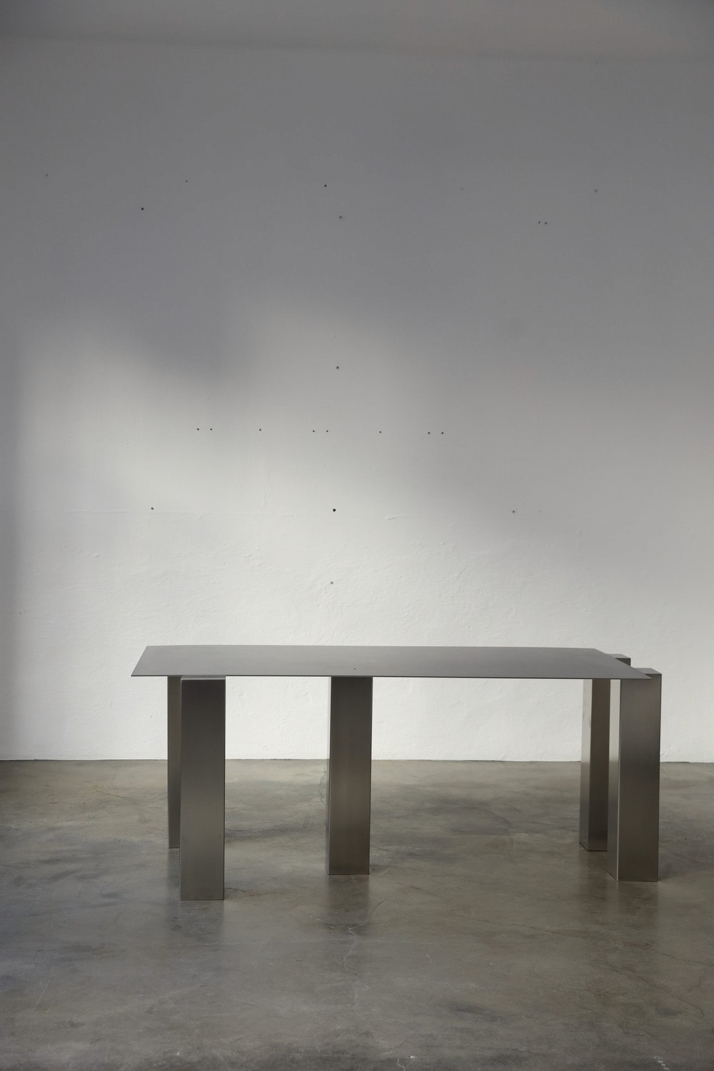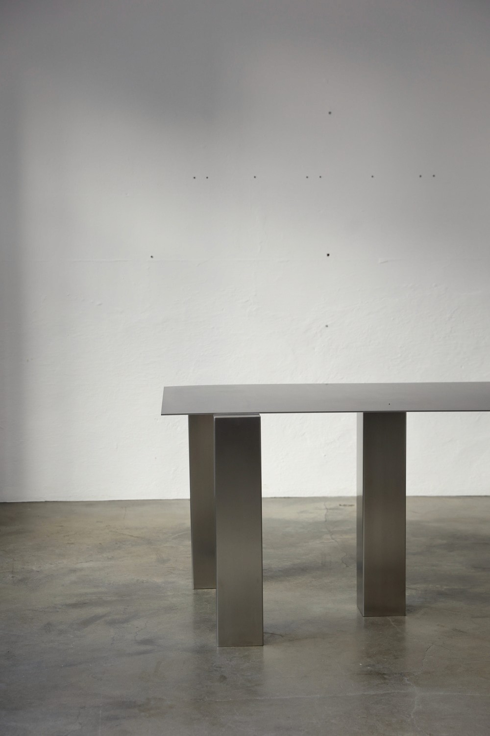 A stainless steel desk defined by a restrained, architectural silhouette. Its monolithic form pairs a thin, precise top with solid rectangular legs, creating a balanced sense of weight and rhythm. The matte surface subtly reflects light, emphasizing the material’s raw yet refined character.