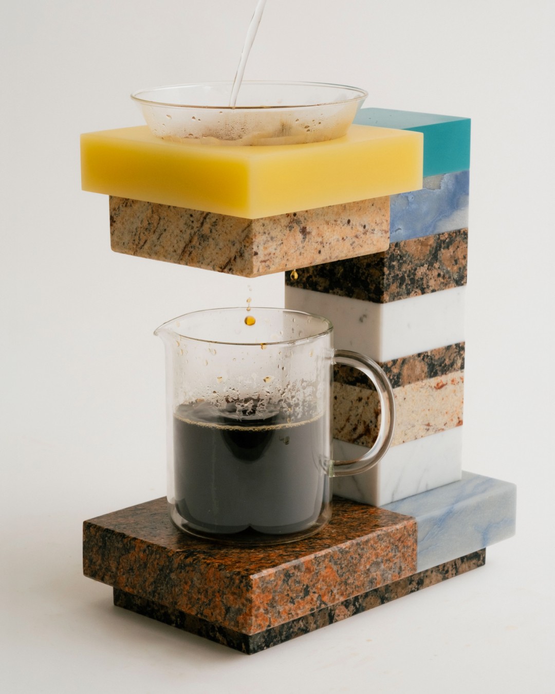 Her newest object, Stone Drip, continues her exploration of coffee making objects. Crafted from stacked layers of natural stone and resin, the piece combines vivid color contrasts with precise geometry, translating her bold design language into the realm of pour-over coffee.