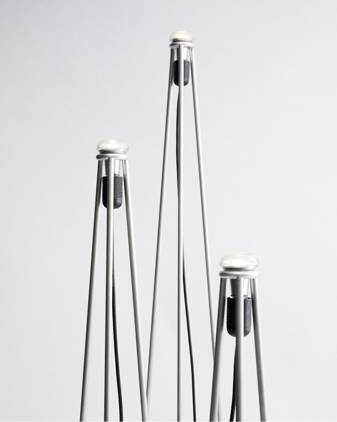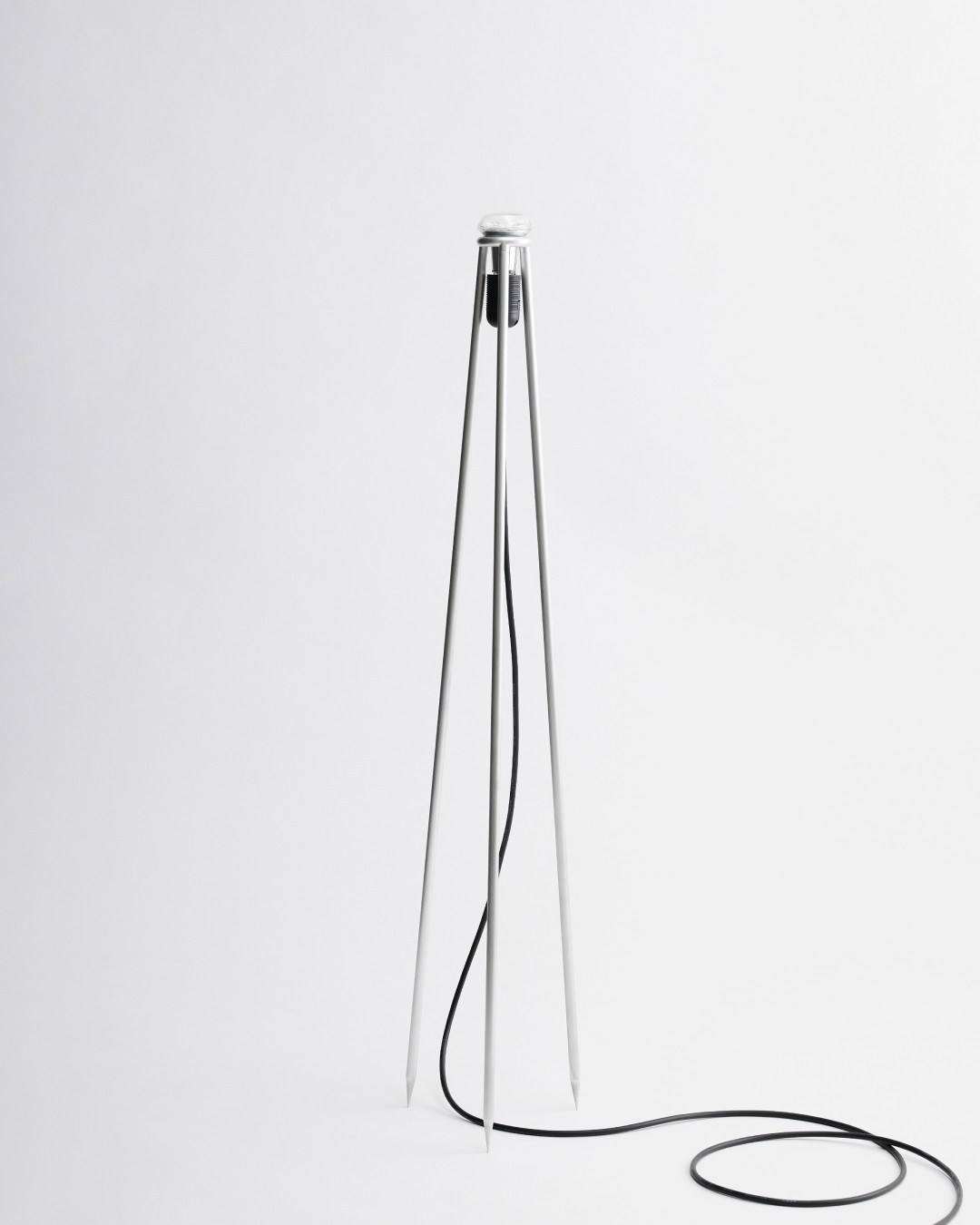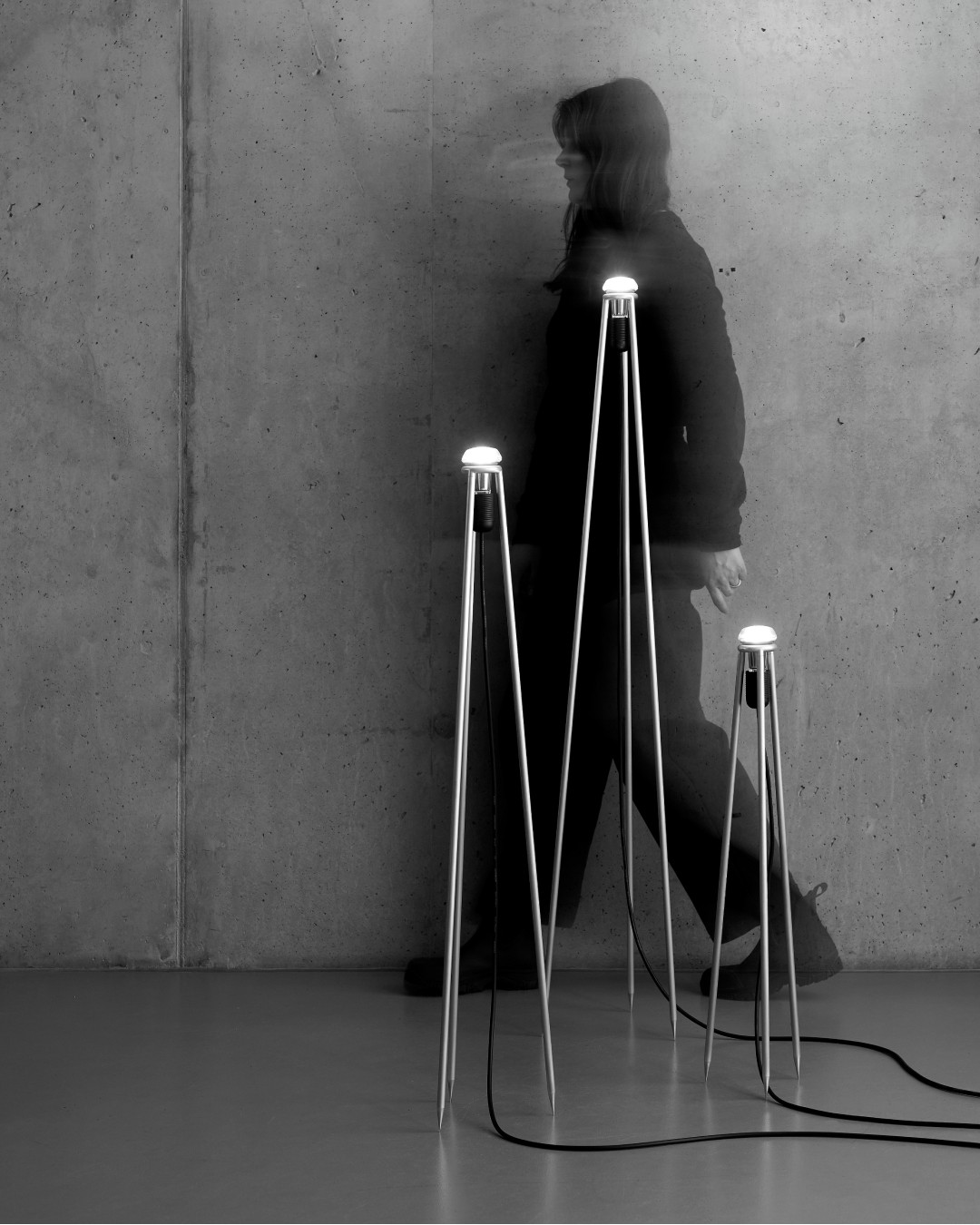 The Trilight is based on the same system as the Chunk Stool and Chair - it consists of cylindric shapes and extruded circles.The CNC milled ring is connecting the hand milled legs in an angle to secure a safe stand of the light where the light bulb is placed on top. The legs have a pointy but slightly rounded end.